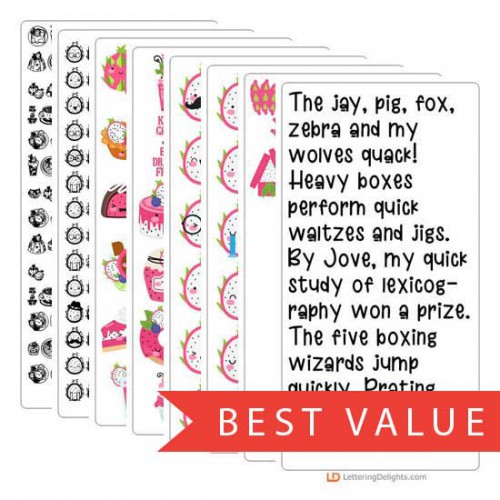 This fun collection features different Dragon Fruit treats with Kawaii style faces and emojis, perfect for cards, crafts, gifts, cards, planner stickers, parties, scrap book pages and more!