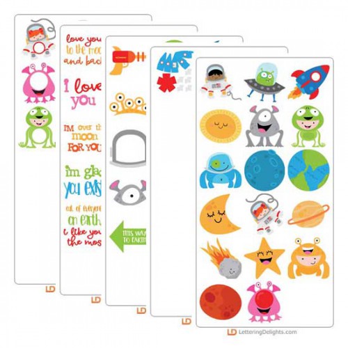 This space-themed set has aliens, astronauts, planets, and more. Great for parties or add w/ our phr..
