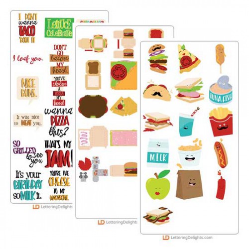 Hamburgers, sandwiches, tacos and happy eats galore! These smiling menu items make fun cards, scrap book pages, planners and more!