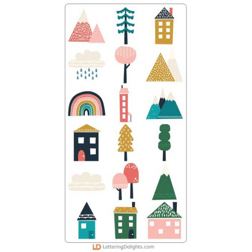 This fun graphic set consists of different landscape features from buildings, mountains, and trees. ..