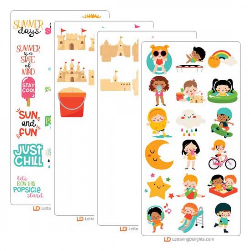 This fun graphic collection features adorable kids doing fun summer activities, summer phrase and sand castes. Perfect for cards, crafts, gifts, planner stickers, scrap book pages and more!
