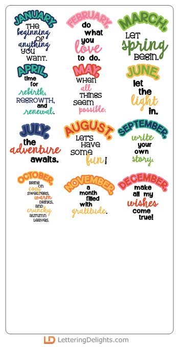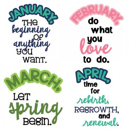 A fun cuttable phrase for each month of the year, perfect for Calendars, scrap booking, card making and more!