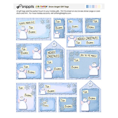 Tags, tags, and more tags. You can't get enough of these inexpensive printable snow angels gift tags. Attach them to your christmas gifts for neighbors, friends, or family. They are adorable in your holiday scrapbooking albums as well. Pair them with the Snow Blokes, Santa's Workshop, and Christmas Fun Snippits gifts tags, and you will be set for the holidays.