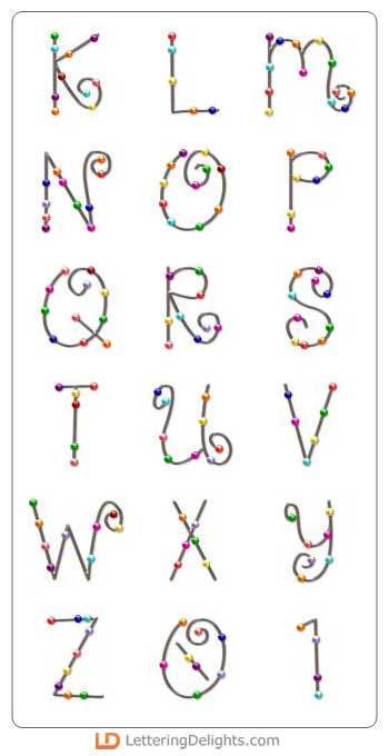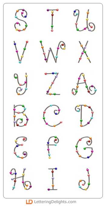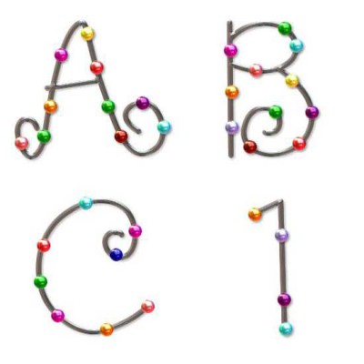 The letters of this alphabet are made up of swirly letters. Each letter has a collection of color beads. It definitely has that festive look.