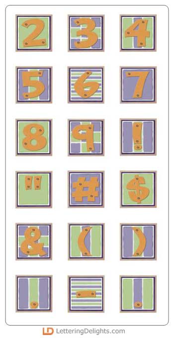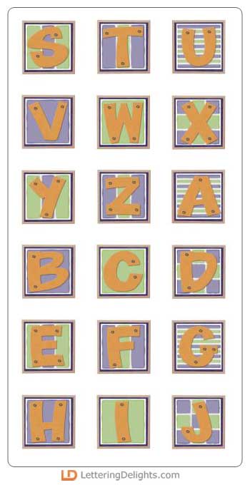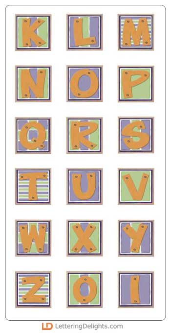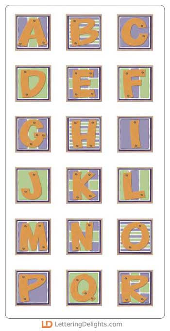 This alphabet has a box around each letters. There are pastel colored patterns inside with the box with the letter placed in the middle.