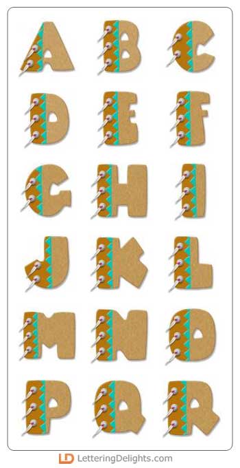 Each letter of this alphabet contains Native American style "clothing". It includes buttons and tassels.