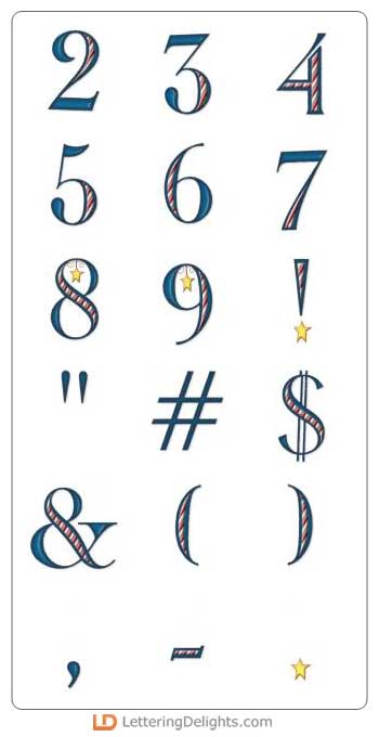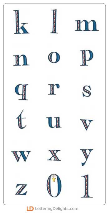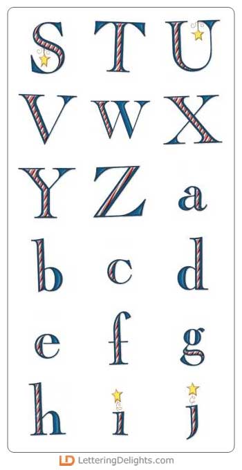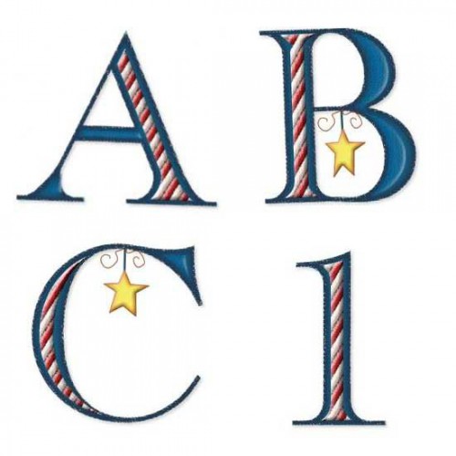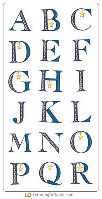 Each letter of this alphabet has candy cane stripes inside. Most of the uppercase letters also have a hanging star ornament. It's very festive.