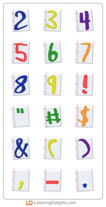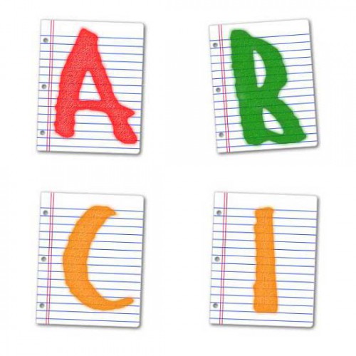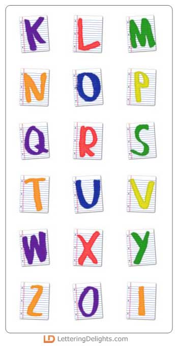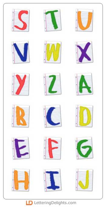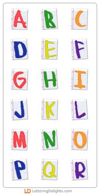 Each colorful letter of this playful alphabet is framed by a lined sheet of school paper. The letters are slightly tilted giving it a childlike look. It is very cute.