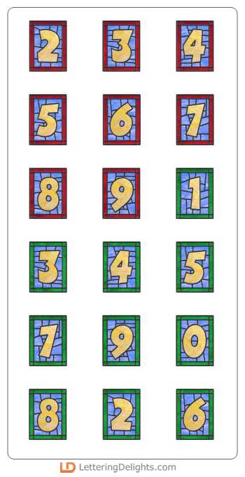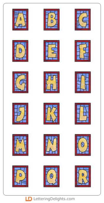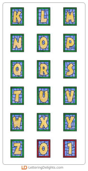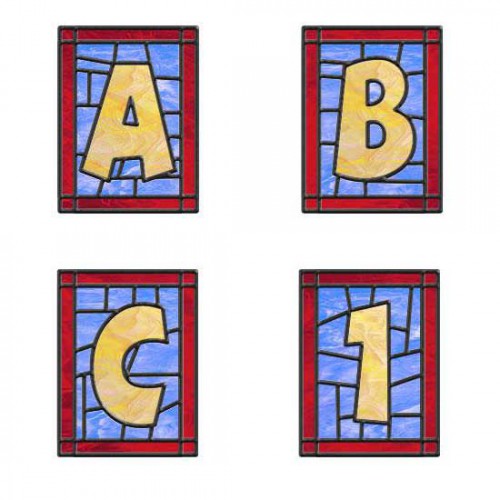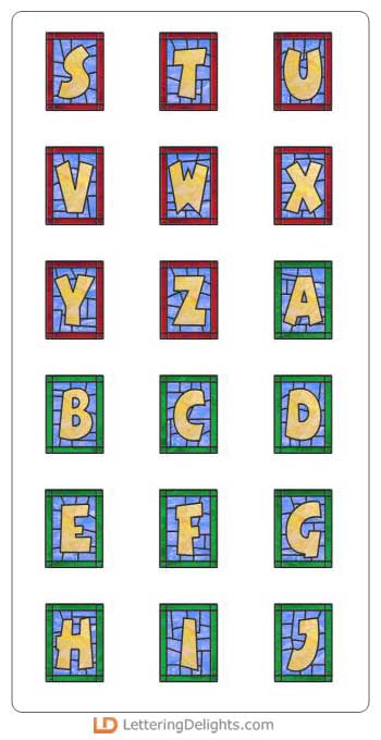 This wonderful Alphabet has the letters centered inside a stained glass window. The glass is multicolored and is beautiful.
