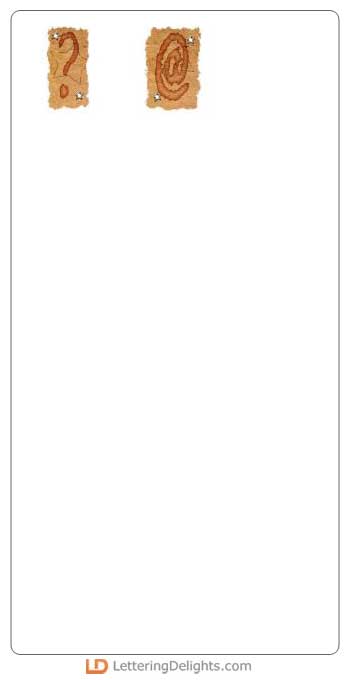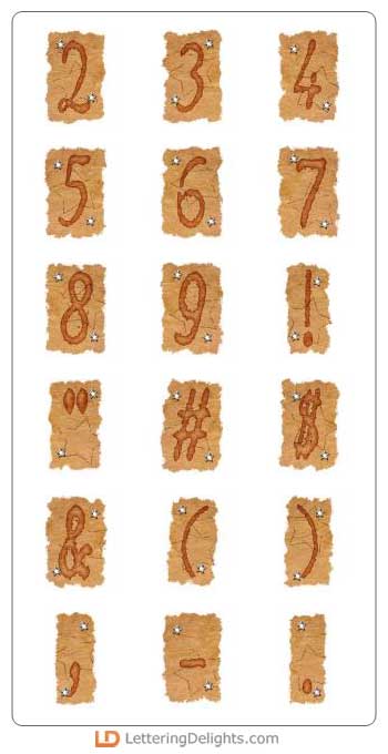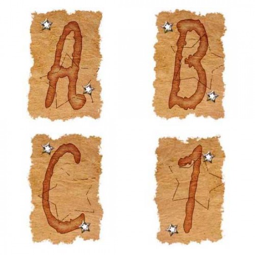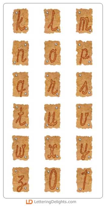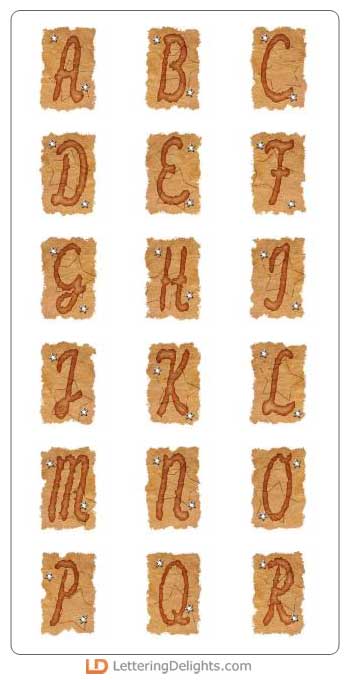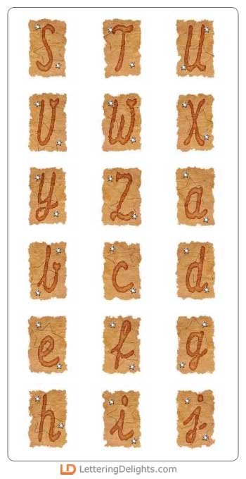 Each letter of this alphabet is nestled inside a brown torn parchment looking piece of paper. There are star eyelets on the brown paper. It looks great.