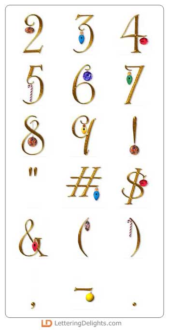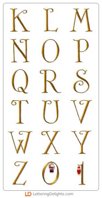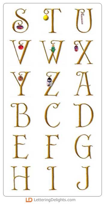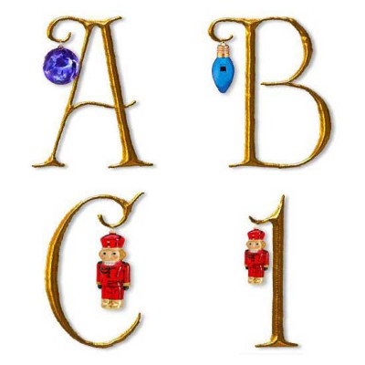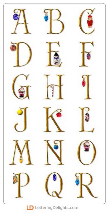 The lowercase letters of this alphabet are a beautiful gold color. The uppercase letters of this alphabet are the same beautiful gold color, but each have a hanging Christmas ornament.