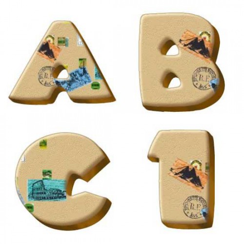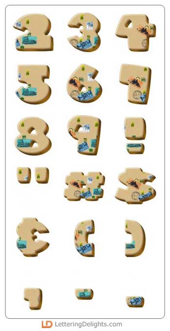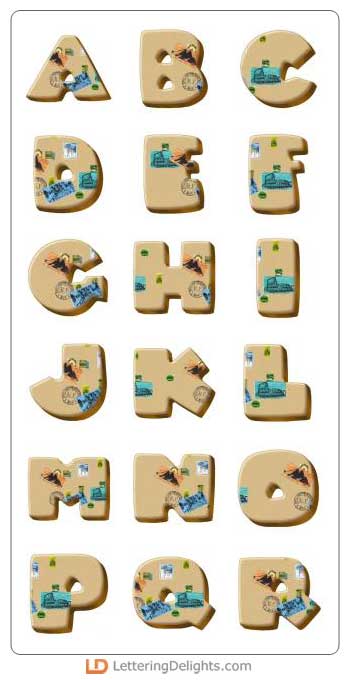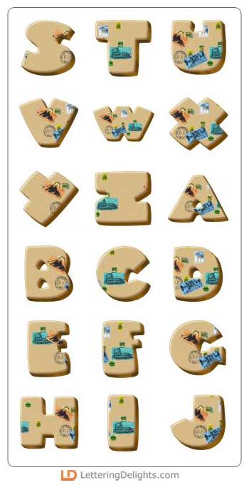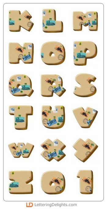 This alphabet looks as if it's been on vacation. It looks like those old trunk suitcases that people put stickers on to show where they had traveled.