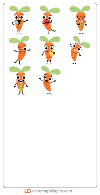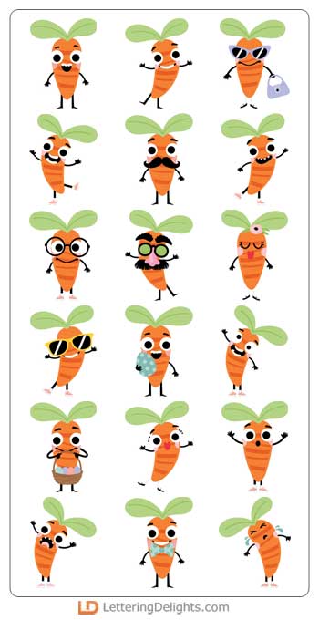 This adorable cuttable graphic set features 26 carrot emoji characters perfect for Easter, cards, crafts, gifts, planner stickers, parties, scrap book pages and more!