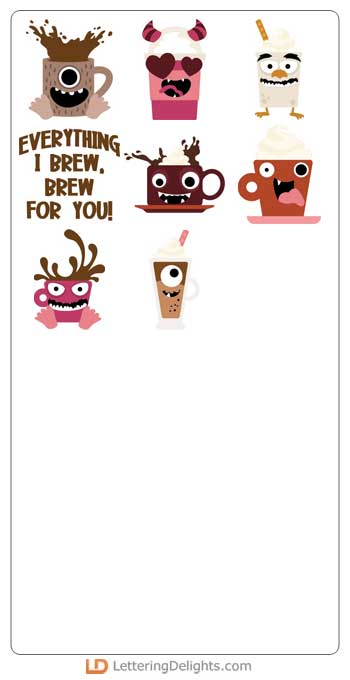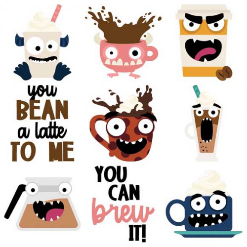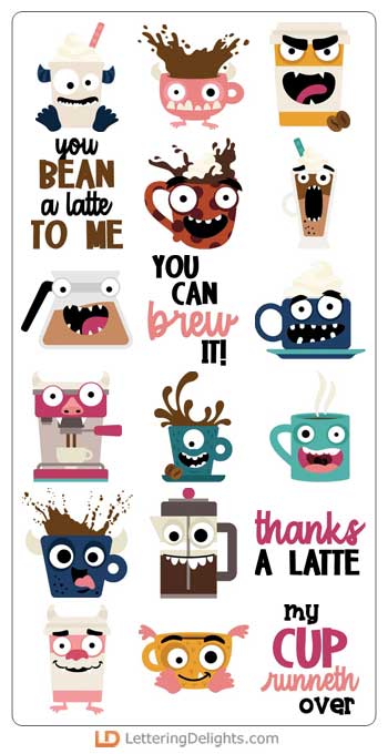 This fun cuttable graphic set features 26 adorable monsters coffee cups perfect for cards, crafts, gifts, planner stickers, classrooms, scrap book pages and more!