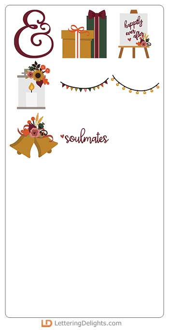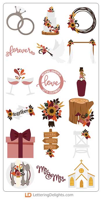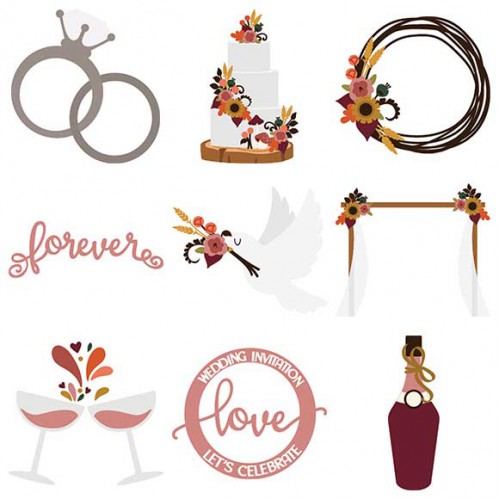 This beautiful cuttable graphic set features 26 wedding receptions imagery in fall colors and florals, perfect for any marriage celebration, formal event, parties, crafts, cardmaking, scrap book pages, planner stickers, decor and more!