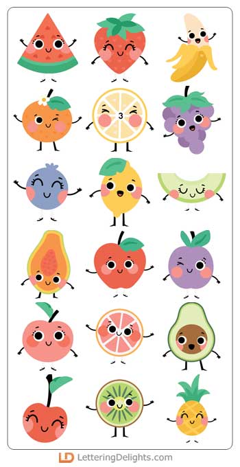 This adorable cuttable graphic set features 26 fruit with happy faces. Perfect for cards, crafts, gifts, parties, decor, scrap book pages, planner stickers and more!