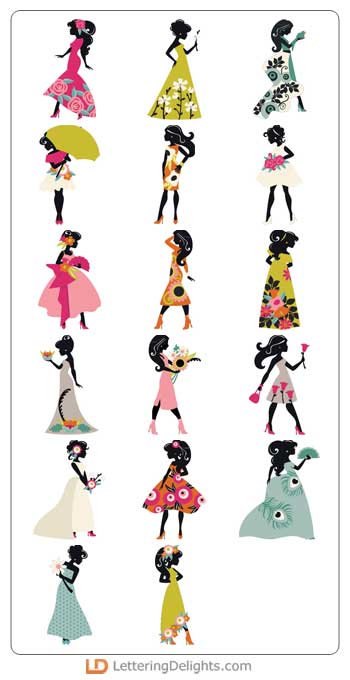 Beautiful silhouetted ladies fashionably dressed, fun womanly accessories, floral adorned frames and..