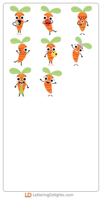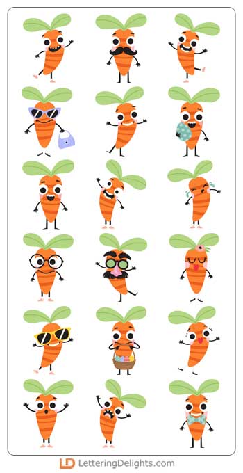 This adorable graphic set features 26 carrot emoji characters perfect for Easter, cards, crafts, gifts, planner stickers, parties, scrap book pages and more!