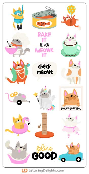 This adorable graphic set features 26 whimsical cats living their best life. Perfect for cards, crafts, gifts, planner stickers, scrapbook pages, classrooms and more!