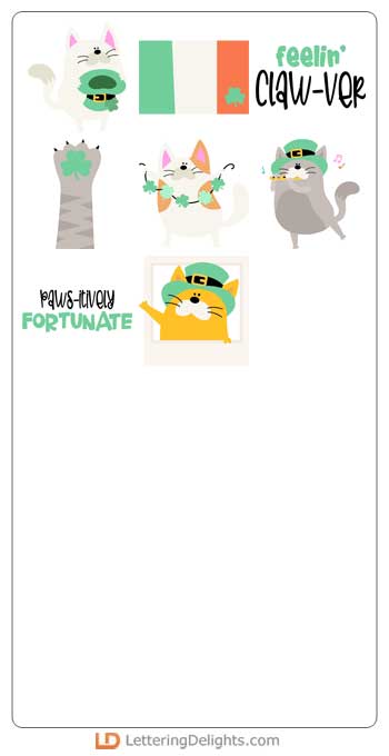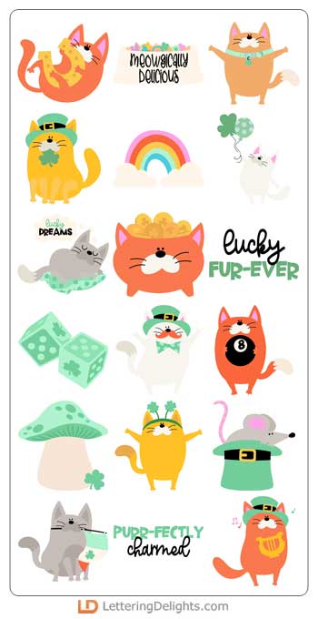 This adorable graphic set features 26 whimsical cats living their best lucky life. Perfect for cards, crafts, gifts, planner stickers, scrapbook pages, classrooms, St. Patrick's Day and more!