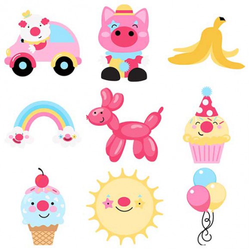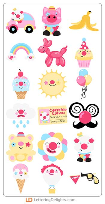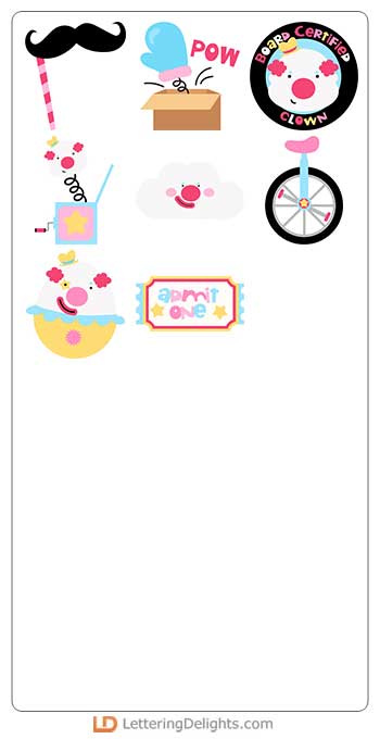 This fun graphic set features 26 clowns and carnival themed imagery. Perfect for cards, crafts, parties, gifts, planner stickers, classrooms, teachers, scrap book pages, cardmaking and more!
