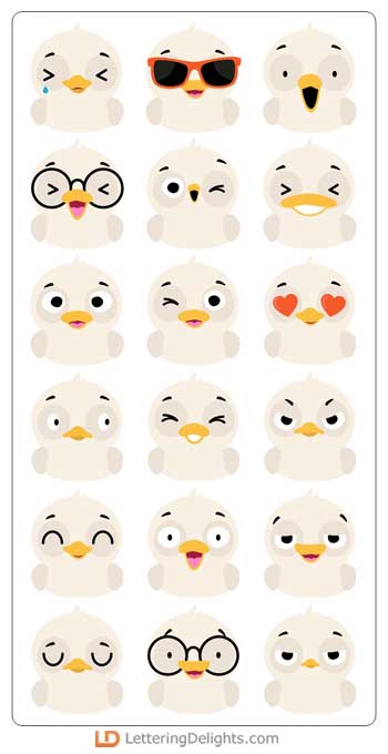 This graphic set features 26 adorable ducky emojis. Perfect for cards, crafts, gifts, classrooms, planner stickers, parties, scrapbook pages and more!