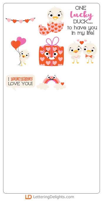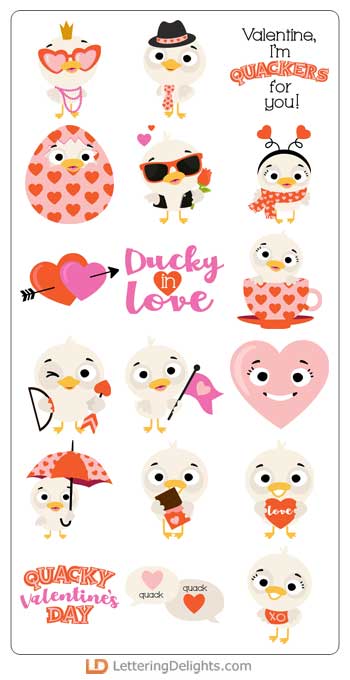 This graphic set features 26 adorable ducks in love and ready for Valentine's Day. Perfect for cards, crafts, gifts, classrooms, planner stickers, parties, scrapbook pages and more!