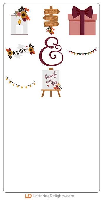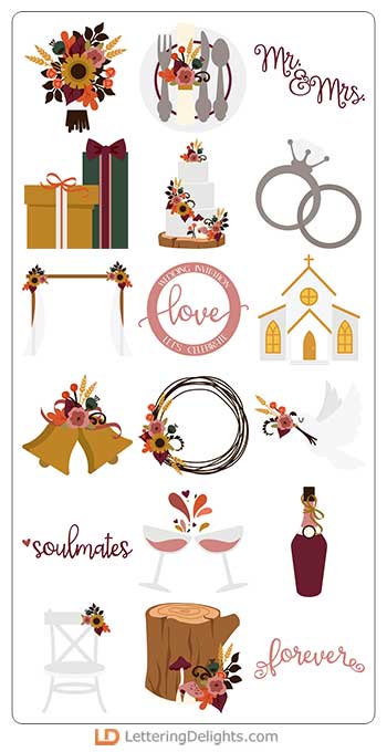 This beautiful graphic set features 26 wedding receptions imagery in fall colors and florals, perfect for any marriage celebration, formal event, parties, crafts, cardmaking, scrap book pages, planner stickers, decor and more!