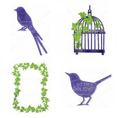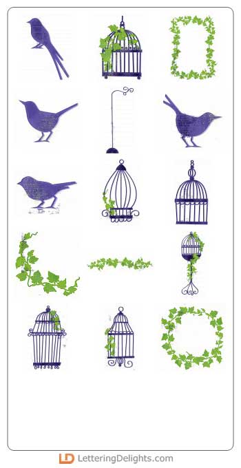Ladybird is a charming assortment of antique bird cages, along with their beautiful feathered inhabitants. Touches of ivy are used as borders and frames.