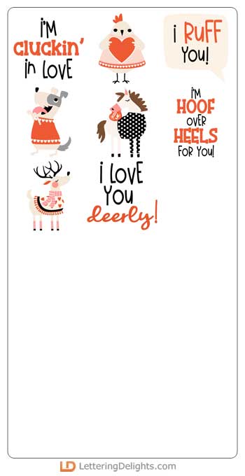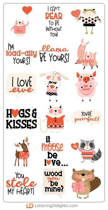 This adorable graphic set features 26 love animals and puns that are perfect for cards, crafts, gifts, planner stickers, scrapbook pages, classrooms, Valentines and more!
