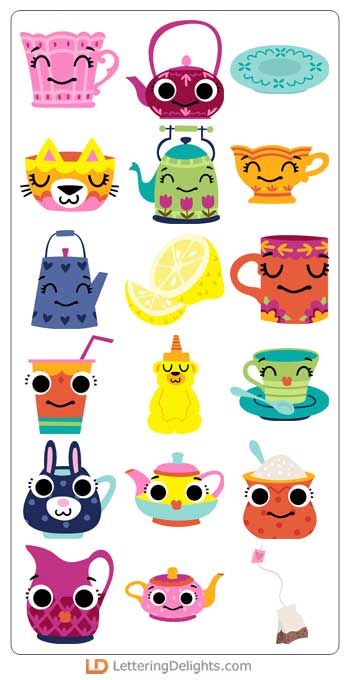 This fun graphic set features 26 tea themed imagery in cute Kawaii style. Perfect for cards, crafts, gifts, parties,planner stickers, scrapbook pages and more!