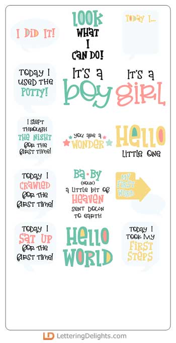 Add these baby firsts and phrases to your Pipsqueaks graphics. Perfect for cards, scrap book pages, planner stickers, gifts and more!