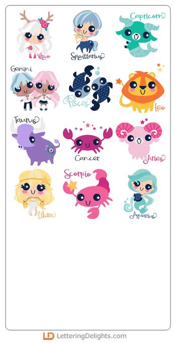These adorable starry-eyed zodiac characters are perfect for creating adorable cards, gifts, decor, planner stickers, scrap book pages and more!