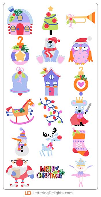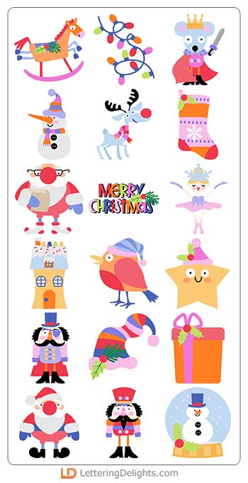 This whimsical graphic set features 27 fun holiday characters and images. Perfect for Christmas, cards, crafts, gifts, classrooms, planner stickers, scrap book pages and more!