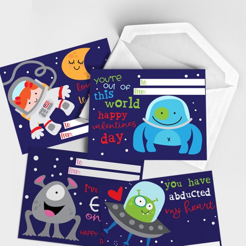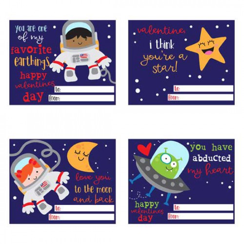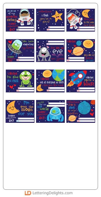 You get 12 separate space-themed Valentine cards you can print and cut to give to friends.