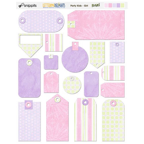 Add creative details to scrapbook pages with pre-made gift tags. Download "Party Kids - Girls" to easily design an eye-catching layout with colorful style. Use this printable page of 18 coordinating tags to make embellishments for greeting cards and party invitations, or attach them on to gifts for the birthday girl.