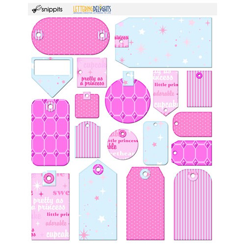 Add style and dimension to papercrafts with ready-made, printable gift tags. This page of 18 coordinating tags match with other 'Little Princess' scrapbooking supplies, so you can design your layout with ease.