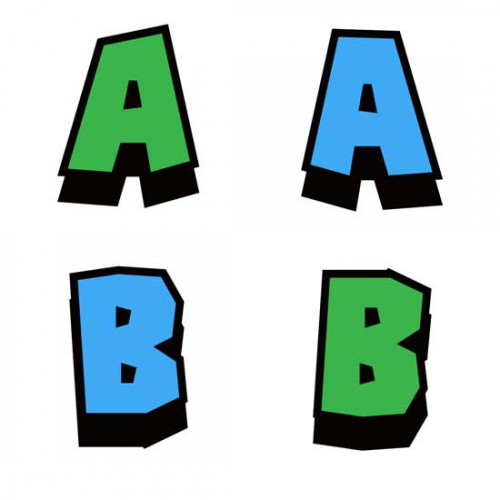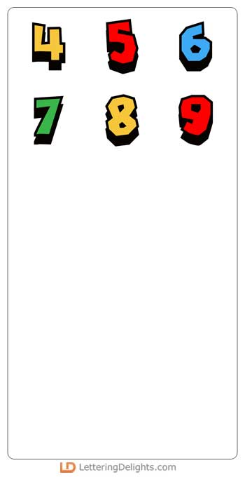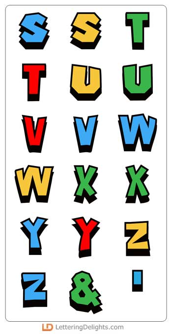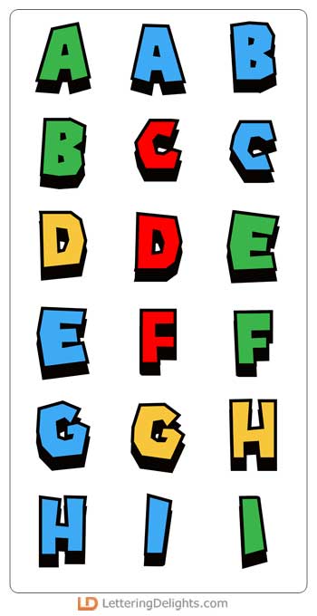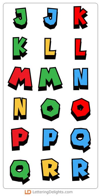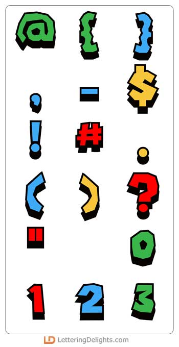 This full-color font/alphabet features blocky video-game-esque lettering with heavy black shadows.