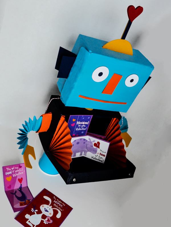 Once the boxes dried, I started to embellish with my robot accents. I glued my antennae to the slot I cut out for the valentines to drop in.