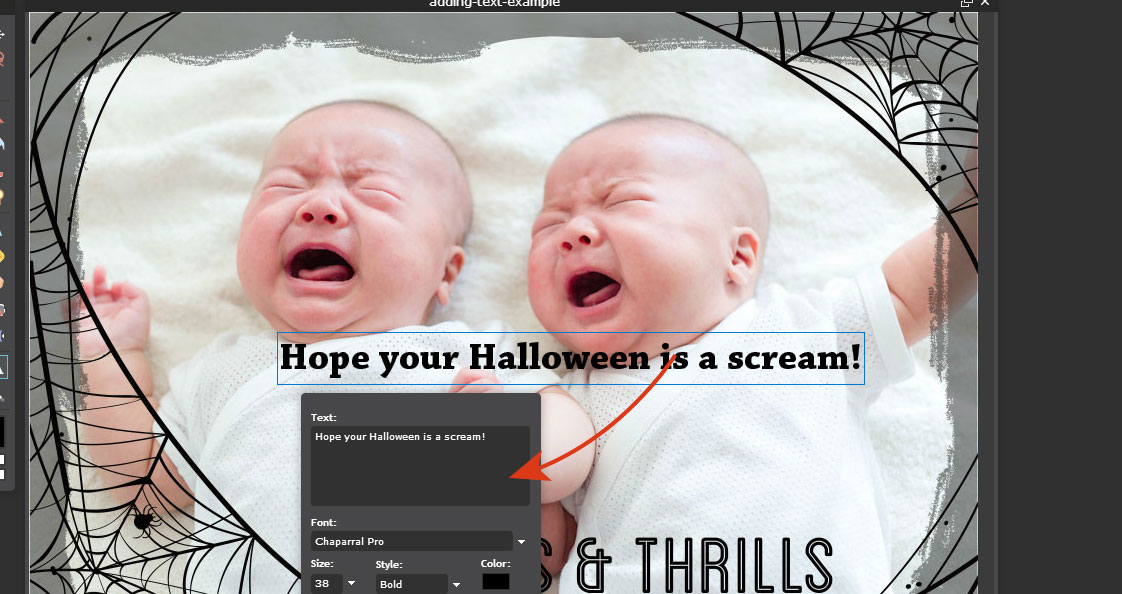 4. Immediately click on your image where you want your text. Don't worry if it's not exactly in the right place. It can be moved. A text window will open. Type your words. Choose your font, font size, style, color. Click OK when you are done.