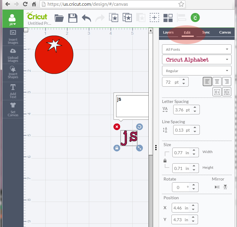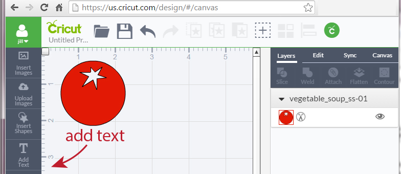 1. Start by uploading your first image to your virtual mat in Cricut Design Space. For complete directions on how to do this follow steps 1-10 in this tutorial. For this tutorial we choose Vegetable Soup _01 (the tomato).