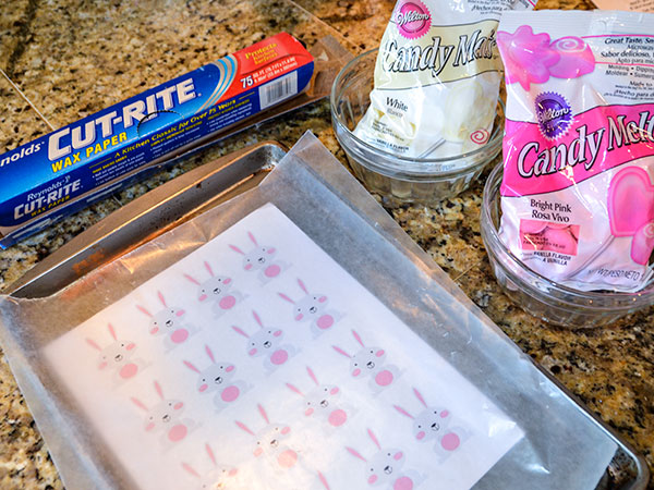 Begin by printing out an army of bunnies from the Little Peanuts Graphic Set. Lay the print out on a cookie sheet and cover with wax paper.
