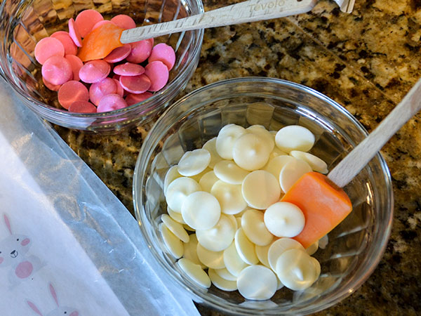 Wait for both sides to completely set up, then you will remelt some more pink candy melt. Peel off your ears, cheeks and tummy one at a time and use a tooth pick to adhere a little melted candy melt to the pieces and stick to the bunny body.