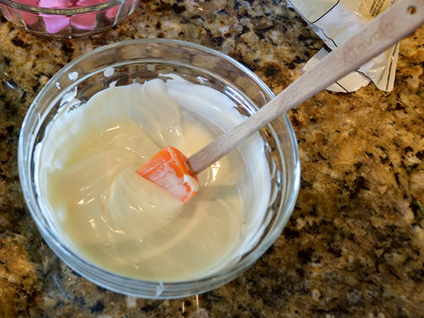 Starting with the white candy melts, pour about half the bag into a microwave safe bowl, and follow the directions to melt them.
