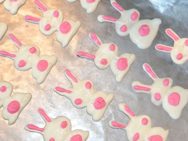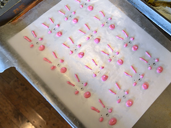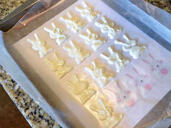 Then you carefully start to trace over the bunnies with your melted chocolate. It may take a few tries before perfection, the melt is easy to scrap back off and put back into the bowl. I start down with one ear, circle around the head and up the other ear, back down and do the body.