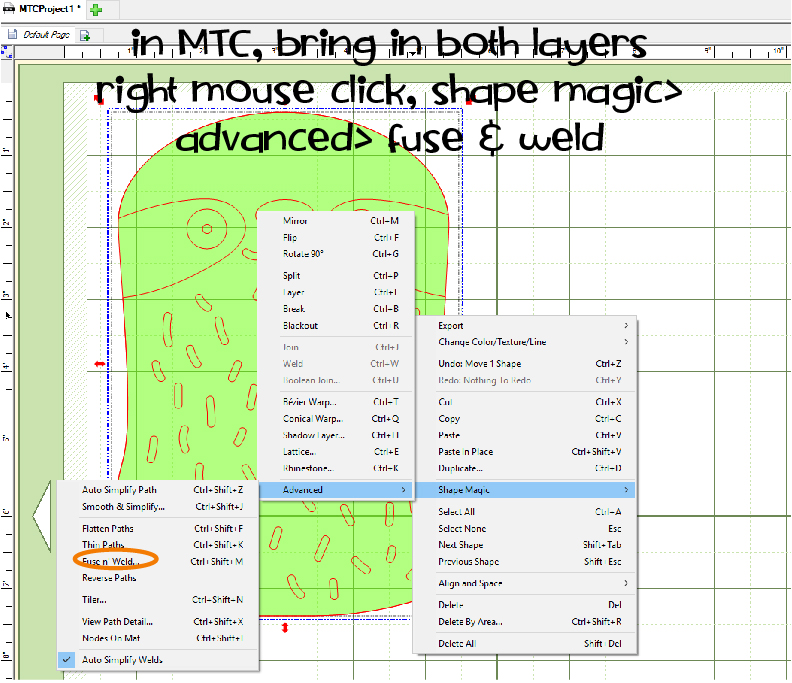 2. b. In Make The Cut, bring in both layers, right mouse click and choose shape magic> advanced> and fuse and weld