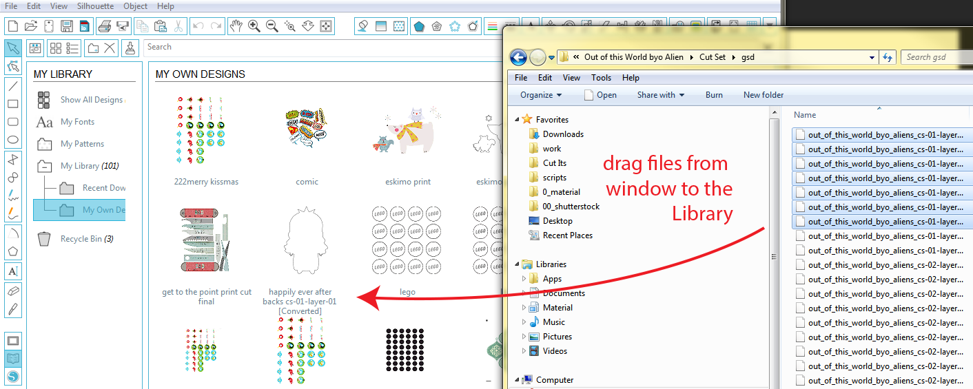 - In another window, open the folder that your LD .dxf files are stored. Make sure you can see both the Silhouette Studio Library and the open folder with the .dxf files.>