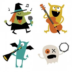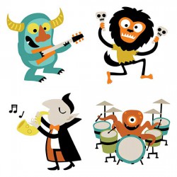 Whisical, fun monsters, playing instruments, singing and dancing and all of there instruments adorn ..