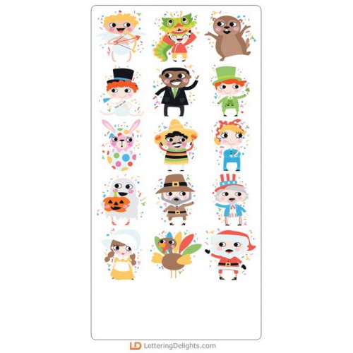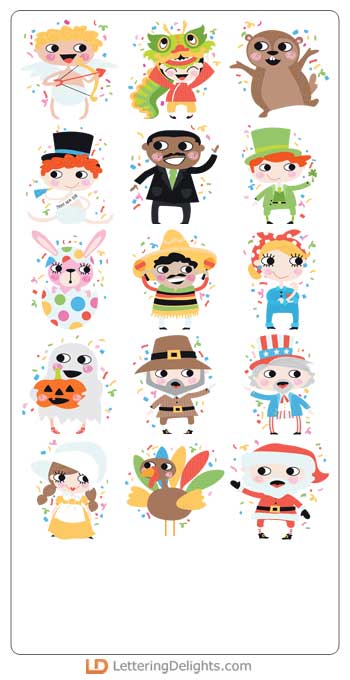Cute, whimsical characters celebrating each holiday in the year, from New Years to Christmas, there is a character to represent each important date!