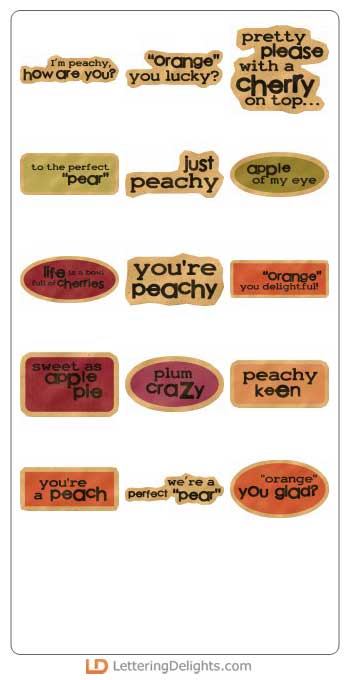 If someone is 'peachy keen' or 'sweet as apple pie", tell them! For all your 'fruity' family and friends, let them know you are 'plum crazy' for them. So go ahead and express yourself with help from the Fruity Expressions graphics set. 'Pear' these expressions with the Fruity Bowl graphics for a tasty combination.